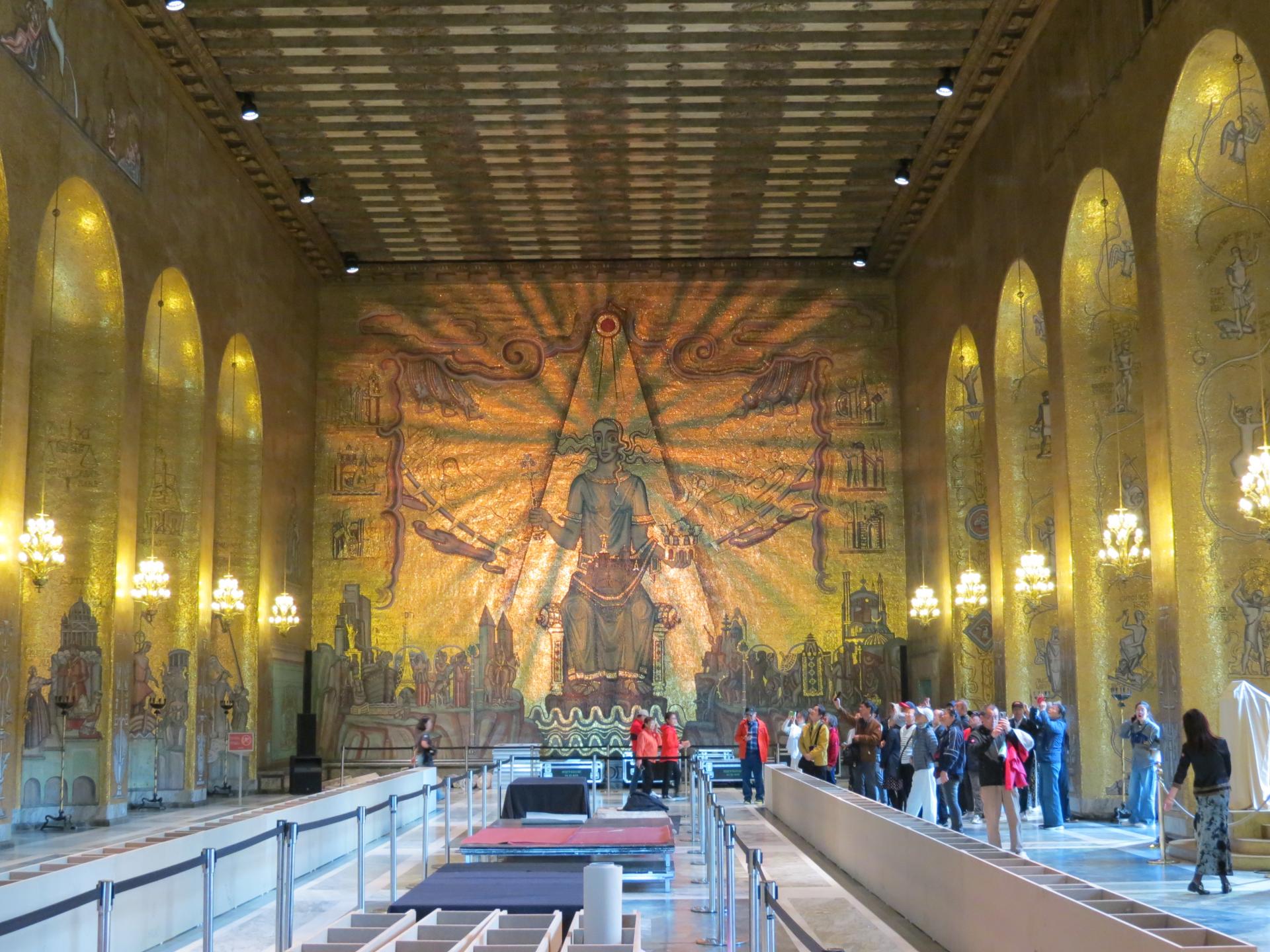 Today we saw the charms of Sweden's capital with a local expert and wandered the medieval streets of Gamla Stan where we saw the 13th-century cathedral. Then we visited the imposing City Hall to see its fabulous Gyllene salen, the Golden Hall with its walls covered in 18 million gilded mosaic tiles, and the Blå hallen (Blue Hall) where the Nobel Prize banquets are held.