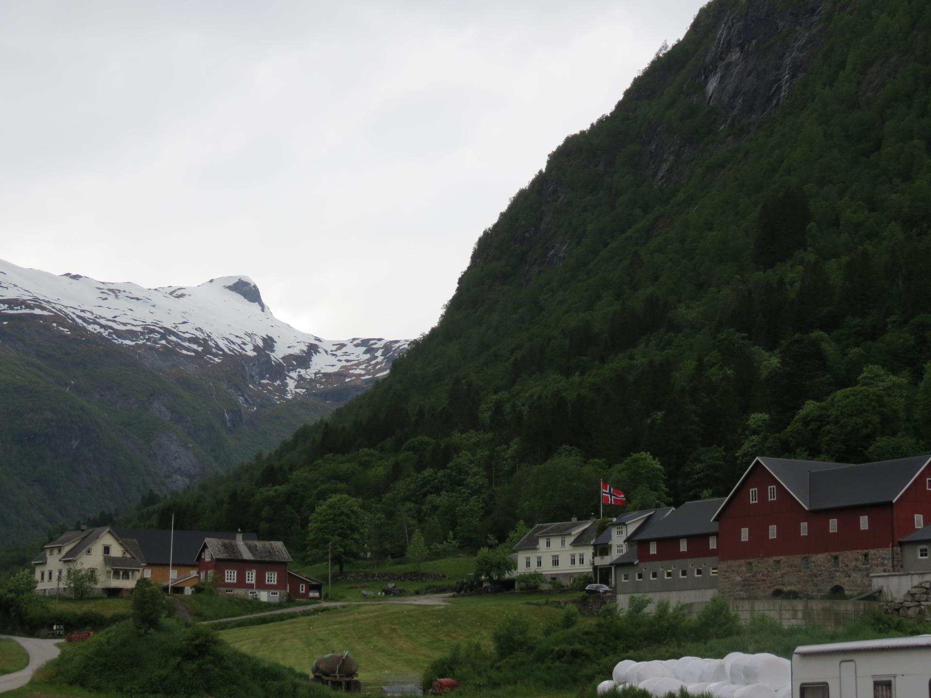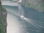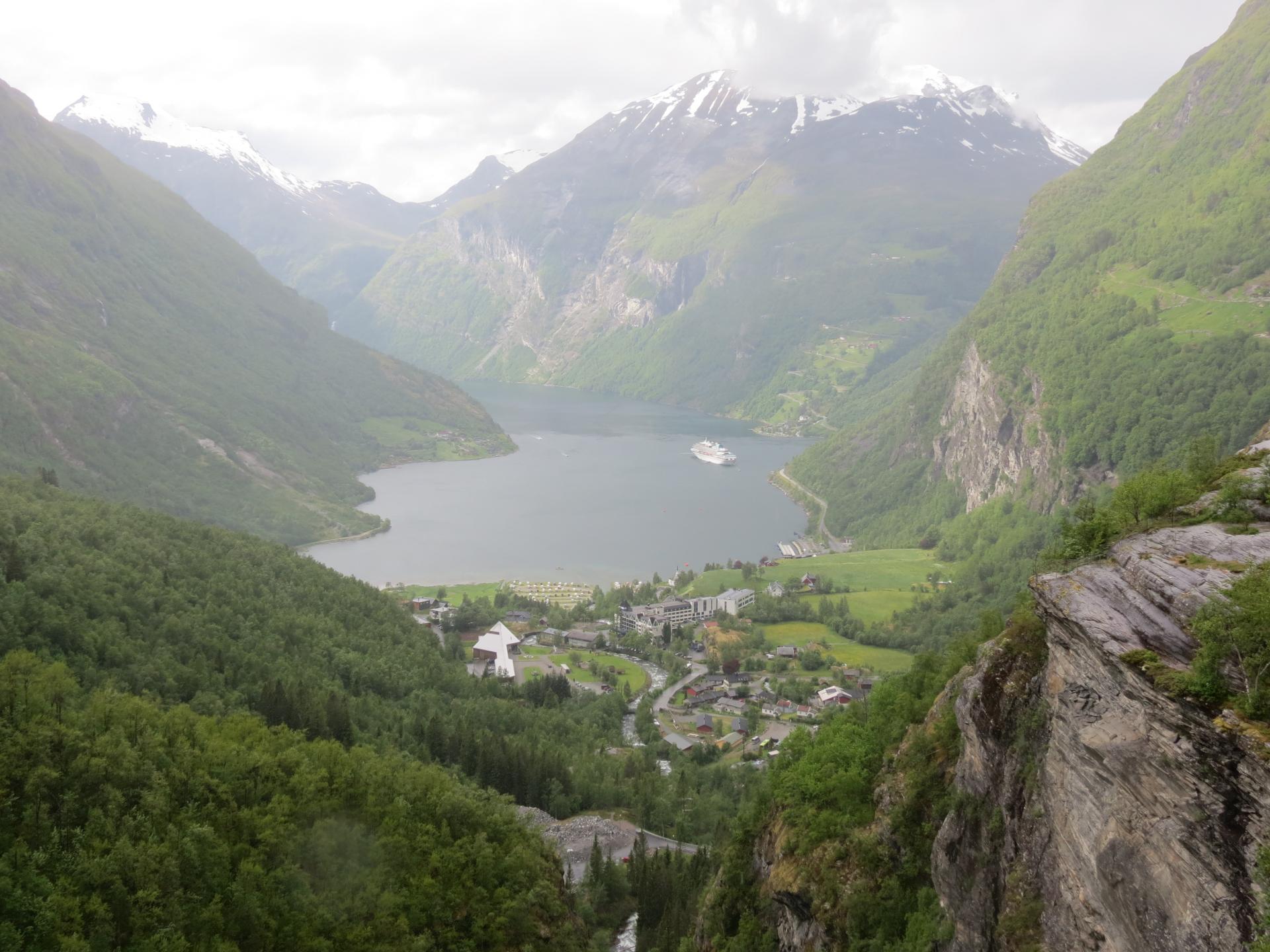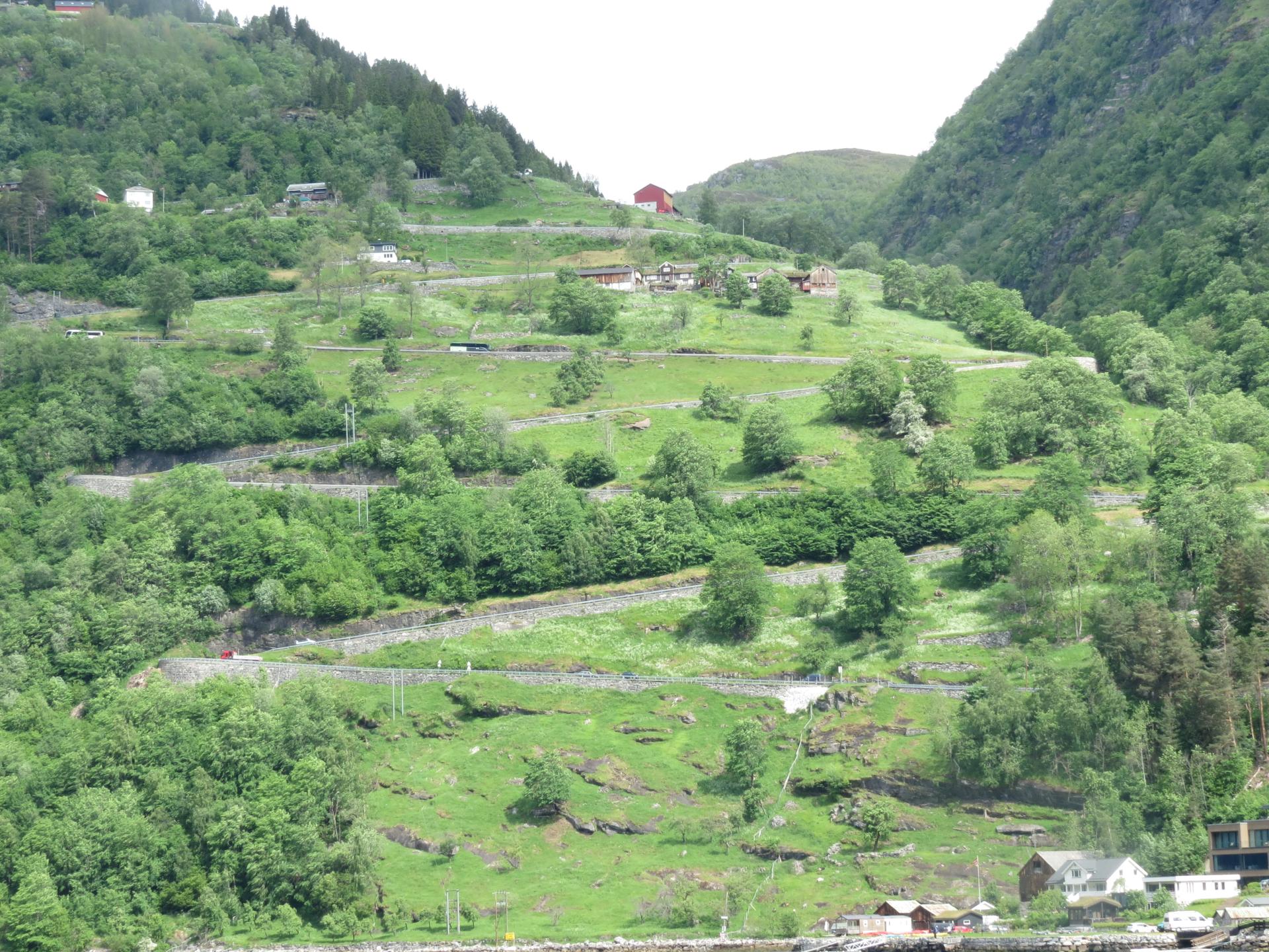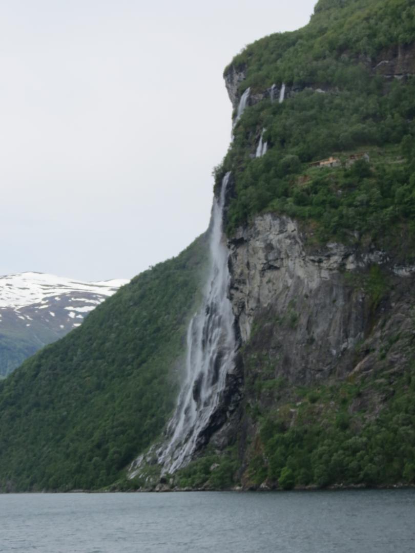 Our coach tour continued northwest from Lillehammer through the countryside of Peer Gynt. Peer Gynt is a five-act play in verse written in 1867 by the Norwegian dramatist Henrik Ibsen. At Lom, we visited the Norwegian stave church that dates back to 1158. Then we traveled along winding roads that passed waterfalls, rivers, ice fields, lakes, and snow-capped peaks. We spent the next two nights in the scenic village of Geiranger, overlooking fjords and soaring mountains.